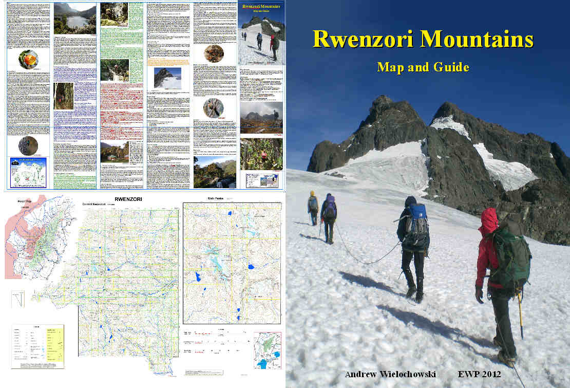 | 1:50,000 - 4 colour topographical map of the Central Rwenzori 1:20,000 - 4 colour topographical map of the Main Peak Area 1:682,000 - 4 colour map of roads around the Rwenzori GPS=5 | Geology and Glaciology Flora and Fauna Medical Aspects Weather Access and Walking Routes Climbing Routes Accommodation Cooking and Food Equipment History Porters and Guides Useful Contacts |