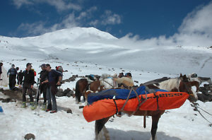 Mount Ararat, reputedly where Noah's ark landed, is at 5137m the highest mountain in Turkey. The area is militarily sensitive and only one route up Ararat is available - from the small flourishing town of Doğubayazit. This may be reached by road either from Kars in 3 hours. Or Van in 2 hours. Kars and Van both have several flights a day from Istanbul and Ankara, Kars may also be reached by a relaxed train journey from Istanbul or Ankara. Kars is of great historic importance and has long been fought for by invading armies. Van was severely damaged by an earthquake in 2011 and is now being rapidly rebuilt. It is located by Lave Van - which is vitually an inland sea. Doğubayazit lies at almost 1650m and is the base for the ascent of Mount Ararat. Not far from the town lies the famous temple of Ishak Paşa also the reputed site of Noah's Arc. The ascent of Ararat involves two camps: at 3200m and 4200m. Few acceptable alternatives exist due to a lack of water and camping places. The ascent above 4200m early in the season is generally on snow that may be icy and might require crampons. Although a rope is carried it is rarely needed as the ascent is non-technical and crevasse problems are negligable. The weather on Ararat is generally stable and it is possible to make an ascent on almost any day. It is however a very high mountain and good acclimatisation is essential. On our programmes we generally prefer this to be done away from Ararat itself as the mountain does not lend itself to acclimatisation treks at a suitable altitude and the campsites are often dirty and sometimes crowded. If no alternatives exist then the best option is to spend 2 nights at 3200m on the way up. On the acclimatisation day you should then walk up part or all of the way to 4200m as a practise day. On the summit day allow about 4 to 5 hours for the ascent and a further 3 to 4 hours for the descent back to the more pleasant altitude of 3200m. Given an early start it is possible to descend all the way and so avoid the 3200m campsite. In the past Ararat has been closed to climbers, then only restricted access was provided. Now access is easy although permits are still required. Some of the local guides and nomads who provide the services are aware of the unsatisfactory toilet and rubbish situation and it is hoped that an organisation of local providers will address these problems, Note: Mount Ararat requires the use of crampons and walking poles but previous experience in the use of them is not essential. In fact Ararat could be a training mountain for those interested in going on to higher and more demanding summits such as Elbrus, Peak Lenin or Kilimanjaro. Ski Ascents are possible in spring and at this time the camps are much more reasonable to stay at. Winter Pictures.